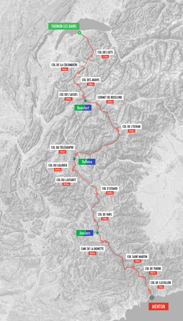 C’était un rêve, un défi que je me suis fixé depuis deux ans. Un parcours taillé pour les amoureux de cyclisme en montagne. Traverser les alpes françaises du nord au sud – du lac Leman à la MéditÉranée – de Thonon-les-Bains à Mentons en empruntant tous les grands cols mythiques.