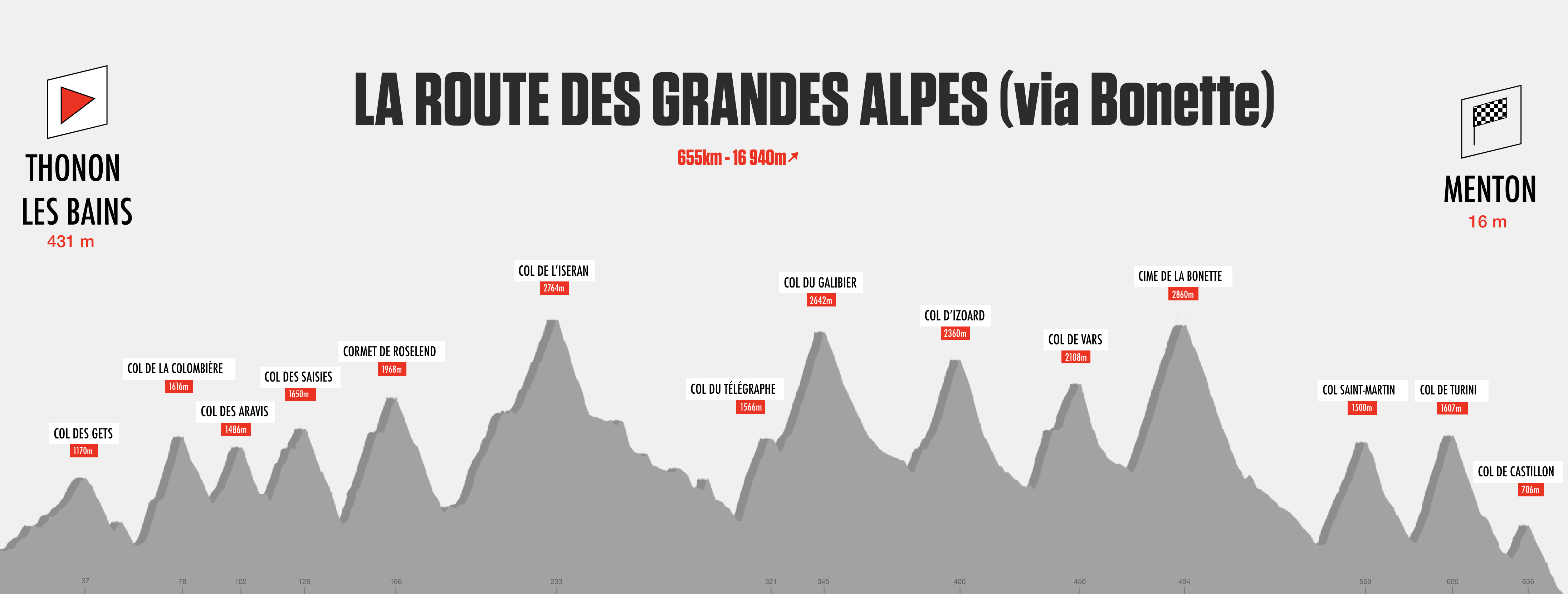 Ce parcours n’est pas la route « officielle » de la route des Grandes Alpes, mais une petite variante. Normalement, la Cime de la Bonette n’est pas empruntée, mais c’est le col de la Cayolle puis le col de la Couillole qui le sont. Deux cols situés plus à l’ouest, au départ de Barcelonette. Également, la fin est située sur la Promenade des anglais à Nice. Mais pour des raisons pratiques, je me suis arrêté à Menton. (C’est plus facile d’accès que Nice!!)