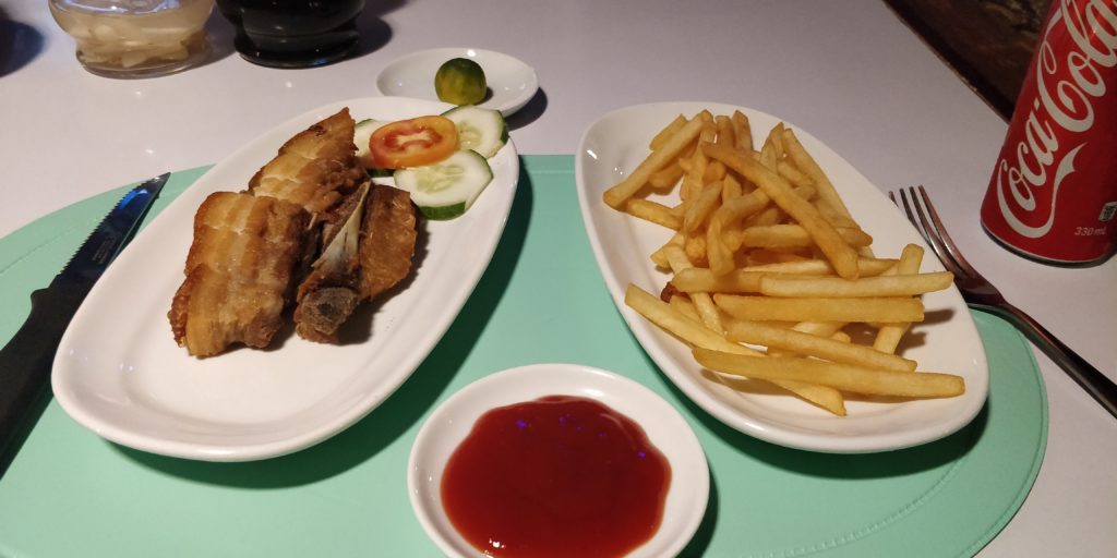 Le soleil couché, il était 6h, je décide d’aller manger un bout dans un resto pas loin de mon hôtel. Un mec venu de nulleppart me propose alors de monter sur son scooter, c’était gratuit, go ! Il me dépose un peu plus loin. Je mange mon petit repas coolos (lechon kawali + frites) dans ce resto cool.
