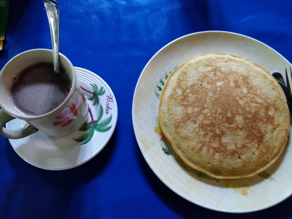Nous partagions cette auberge avec un couple de jeunes français, hyper sympa. Petite soirée au coin du feu, nous quatre et nos deux guides. Notre guide nous offre ses talents de chanteurs/musiciens. Petit gin pas piqué des hannetons. Pour ne pas embêter les esprits, on est obligé de finir les bouteilles d’alcool. C’est une tradition. Avec le soutien de Rémi (l’autre français) et Thomas on termine deux bouteilles.