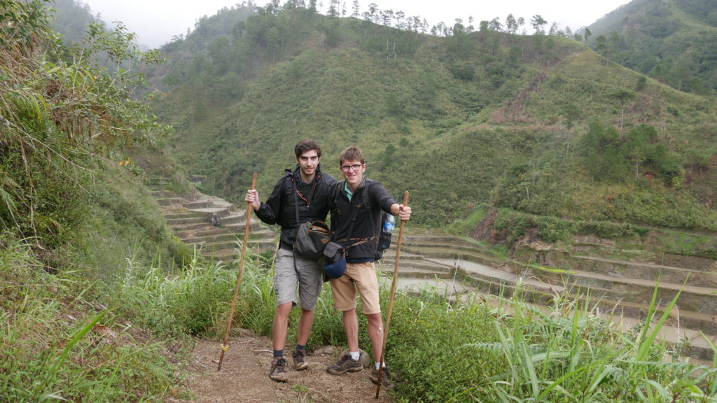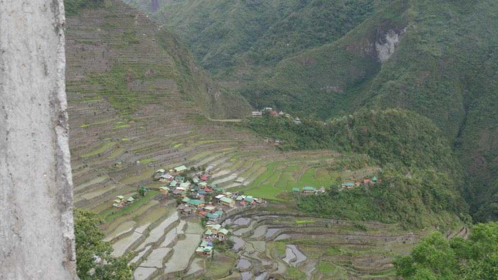 Petit dèj au top, un immense pancake avec de la confiture de fraise. Un régal. On repart vers 9h. Mise en route archi dure, plusieurs centaines de marches à monter. Ça réveille. Puis on emprunte la route, sous la bruine. On retrouve les autres groupes qu’on avait croisé la veille. On s’enfonce dans une descente très très boueuse et dangereuse, sur une musique du grand Michel Sardou – Femmes des années 80. Grâce à ma grande agilité, je ne chute pas, fastoche. On continue pendant 2/3h avant d’arriver dans le village ou on passera la nuit : Batad. 2 petits villages au coeur d’immenses terrasses de riz, un décor à couper le souffle. L’une des plus belles rizières du monde!