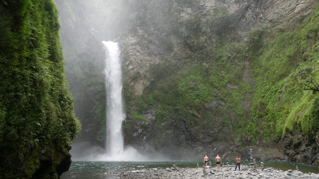 Après avoir poser nos bagages et un petit repas, on part dans une petite excursion pour aller voir une cascade. Encore des marches, mais cette fois en descente (c’est plus facile) et puis on voit cette gigantesque cascade. Magnifique. On se rapproche, on enfile nos maillots de bain. Évidement comme j’ai « peur » de l’eau, j’ai beaucoup de mal à entrer dedans, surtout qu’il y a beaucoup de courant, beaucoup d’endroits glissants et l’eau est froide. Au moins j’aurais essayé.