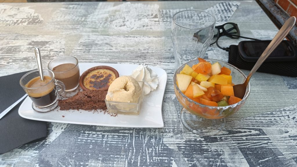 Je retourne au bar pour y manger cette fois, le patron revient vers moi. « Tu as trouvé ? Non… » Une dame vient alors me voir, me demande ce que je fais et me propose de m’aider pour trouver un endroit où dormir. Après deux coups de fil, elle me dégote une chambre dans un gite, pile dans le village. Quelle chance incroyable ! Je fini mon repas, un café gourmand et une salade fruit et fonce vers ce gite.
