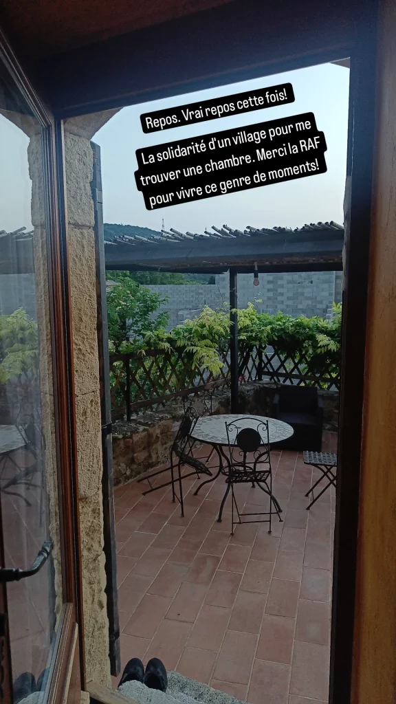 Trente minutes plus tard, j’arrive à Saint-Victor-La-Coste, je vois un restaurant, encore une fois je m’y arrête. Je bois un verre avec de nouveaux amis et je me mets à la recherche d’une chambre pour dormir le soir. Il n’y avait pas grand chose sur les plateformes de réservations. Je décide de demander au patron du bar, on sait jamais! Il me conseille d’aller voir un gite qu’il y avait en face. Le monsieur ouvre directement mais me dit qu’il est complet. Il m’aide cependant à trouver autre chose. Un hôtel dans le village d’après ? J’appelle, c’est dispo, je donne des infos pour réserver. J’ai la lucidité de demander si je pouvais monter le vélo dans la chambre. Il me répond catégoriquement « non, le vélo reste dehors. » Ok lol, bah annulez ma réservation.