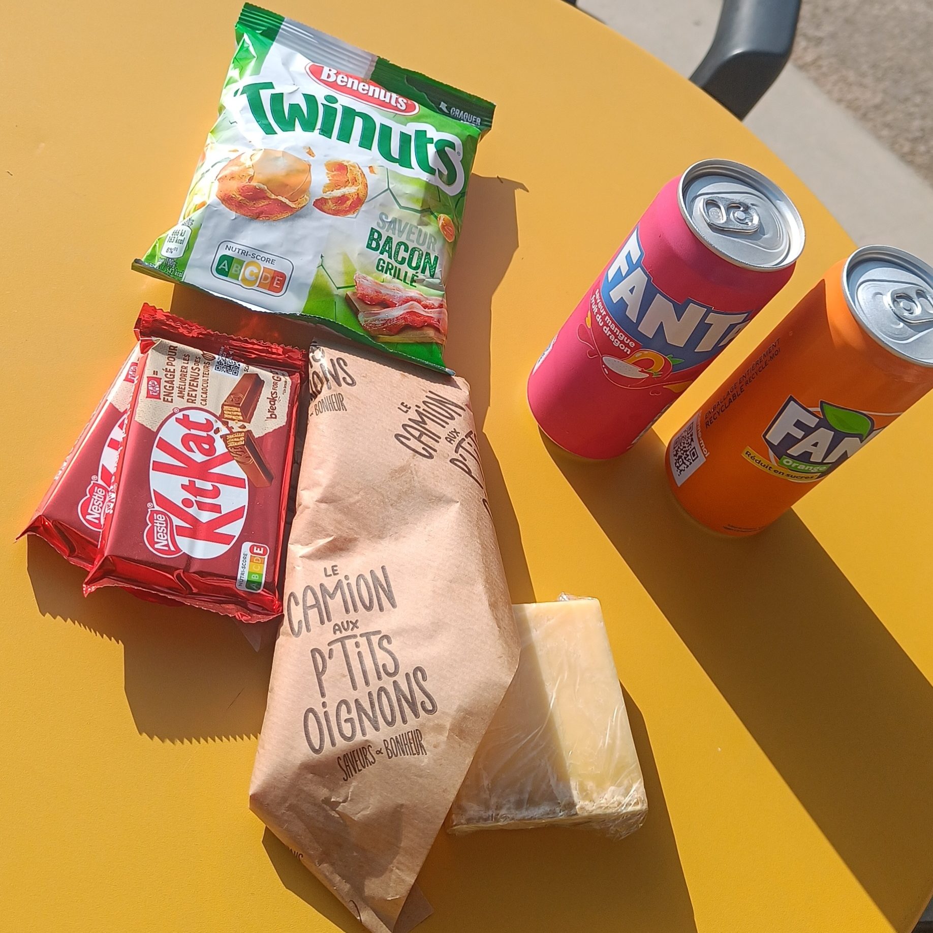 Au sommet d’une côte je fais une pause épicerie, je prend plein de choses : du jambon de pays, du cantal, des sodas, des chips et du chocolat. J’ai pris le temps de manger, ça m’a fait du bien.