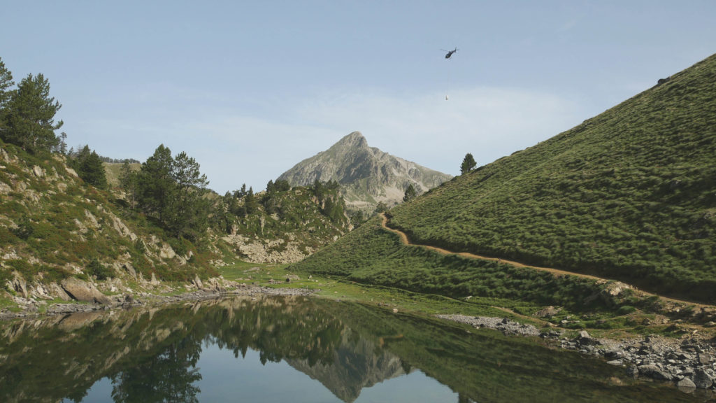 Petit lac avec un hélicoptère survolant le coin. Il apportait des équipements au refuge de Bastan, situé 1km plus loin.